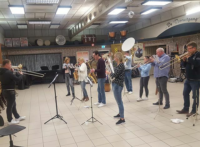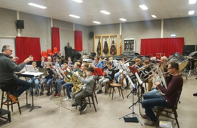 Repetitie van 30 jonge trompet-, bugel-, hoorn--, trombone- en tuba- blazers, en een slagwerker. Naar AllYouNeedIsLove-concert 14 feb 19.00u in Stiphout. Kom luisteren! ift.tt/39cY6En