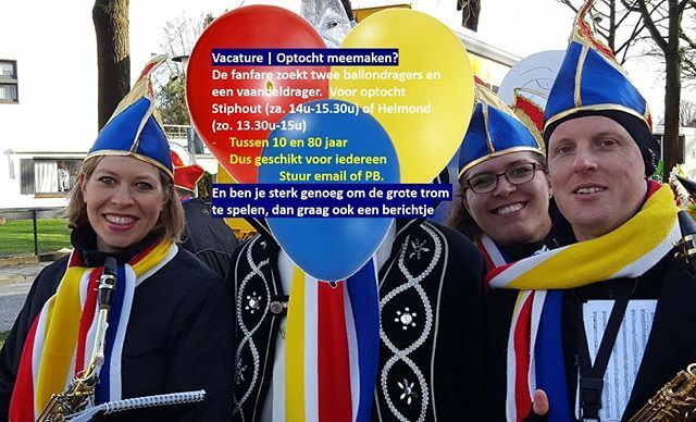 Vacature | Optocht meemaken? De fanfare zoekt twee ballondragers en een vaandeldrager. Voor optocht Stiphout (za. 14u-15.30u) of Helmond (zo. 13.30u-15u) Tussen 10 en 80 jaar Dus geschikt voor iedereen Stuur email of PB. En ben je sterk genoeg om de gro… ift.tt/2VexSNI